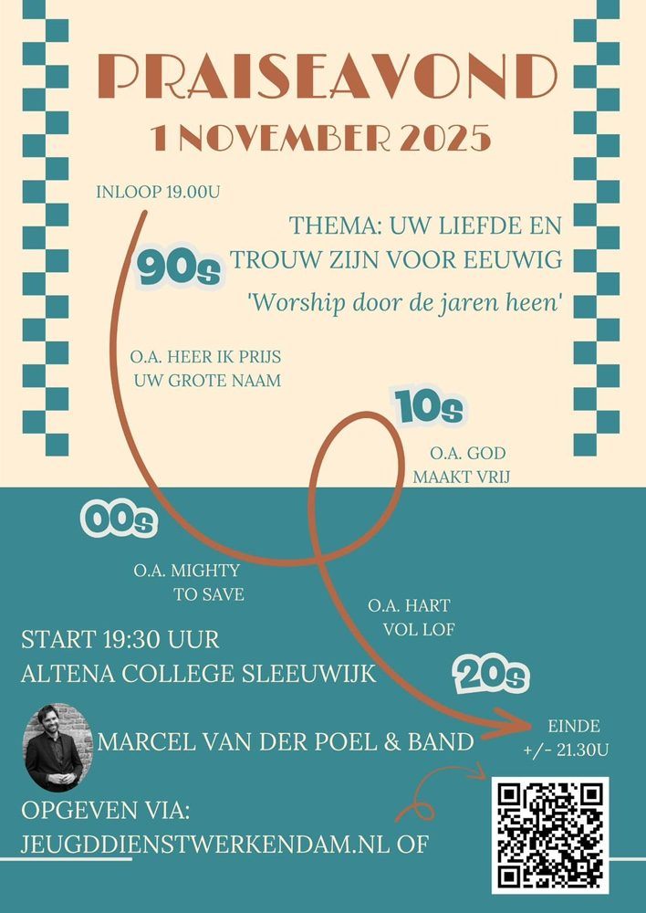 Op zaterdagavond 1 november is er weer een Praiseavond in het Altena College! De inloop is vanaf 19.00 en de avond start om 19.30.