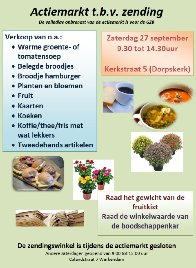 Op zaterdag 27 september van 9.30 uur tot 14.30 uur houdt de zendingscommissie weer haar jaarlijkse verkoopdag, tegelijk met de Biesboschdag. Deze verkoping wordt gehouden op het plein voor de Dorpskerk. Er zal weer, net als voorgaande jaren, een breed aanbod aan spullen aanwezig zijn. Te denken valt aan bloemen/planten, fruit, kaarten, boeken, tweedehands spullen, koffie/thee met wat lekkers, koeken, etc. U kunt tijdens de lunch genieten van vers gemaakte soep, een belegd broodje of een broodje hamburger. Daarnaast kan er ook weer een boodschappenkar of fruitmand gewonnen worden. De opbrengst van deze verkoopdag komt ten goede aan het werk van de GZB en de IZB. U komt toch ook?