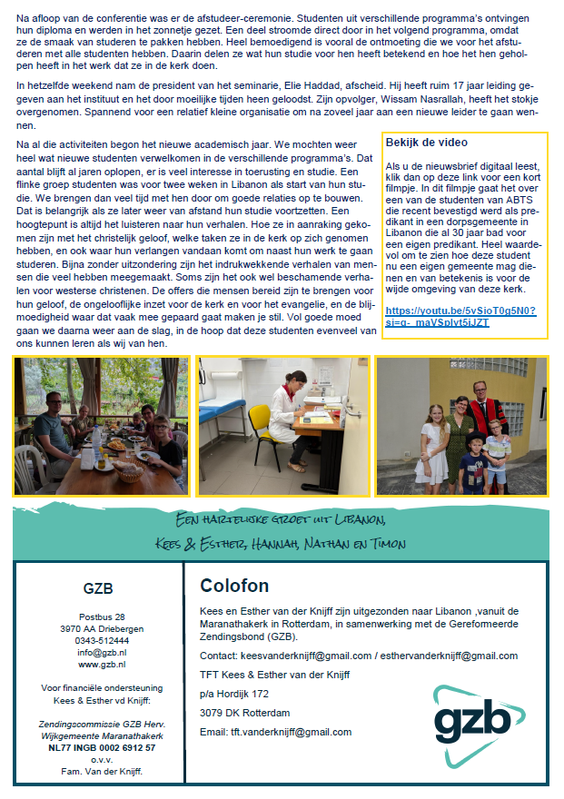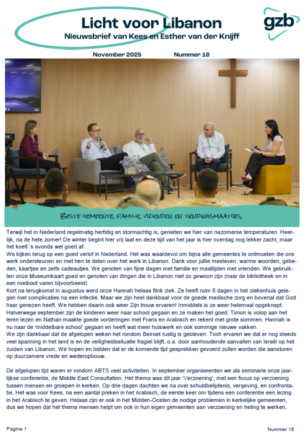 Hieronder vindt u de laatste nieuwsbrief van Kees en Esther van der Knijff, die in Libanon werkzaam zijn voor de GZB. Fijn om op de hoogte te kunnen blijven van hun werk dat ze daar mogen doen. Laten we hen steeds in het gebed opdragen aan de Heere.