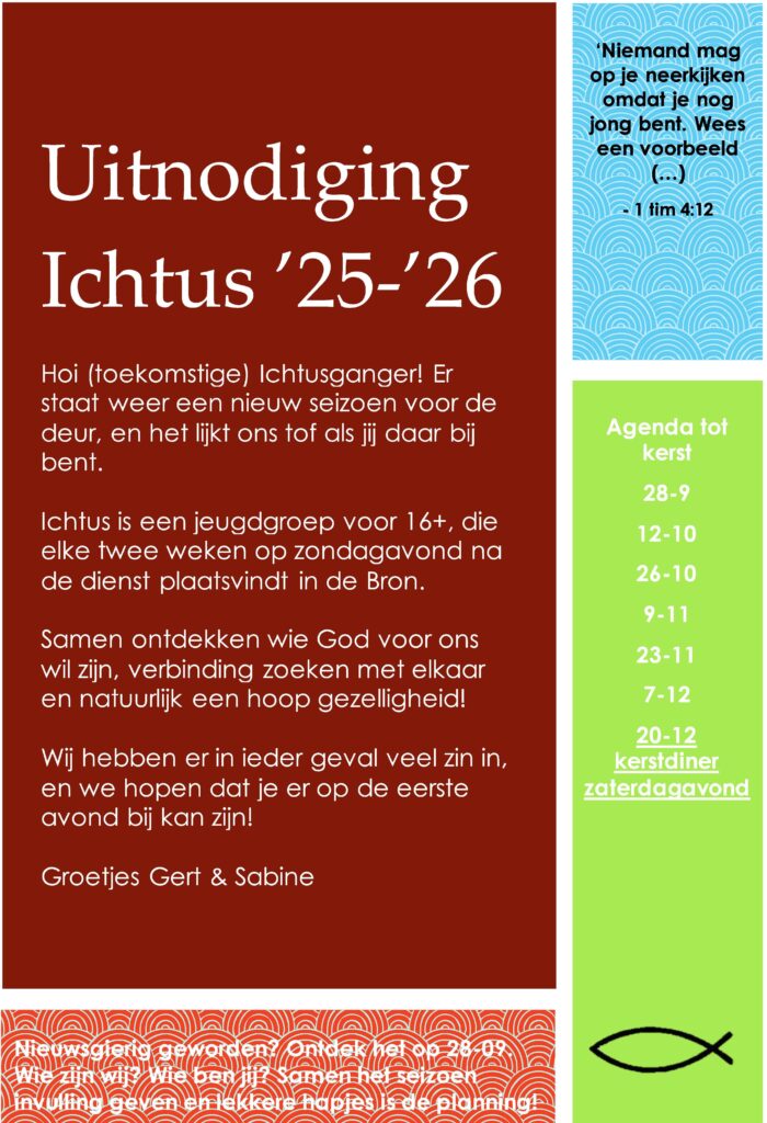 De eerste avond van dit seizoen is 28 september. De avonden beginnen met inloop vanaf 19:30 uur. Om 20:00 uur starten we met een inleiding van de leiding of van de jongeren zelf. Na de pauze organiseren de jongeren zelf een spel of activiteit.