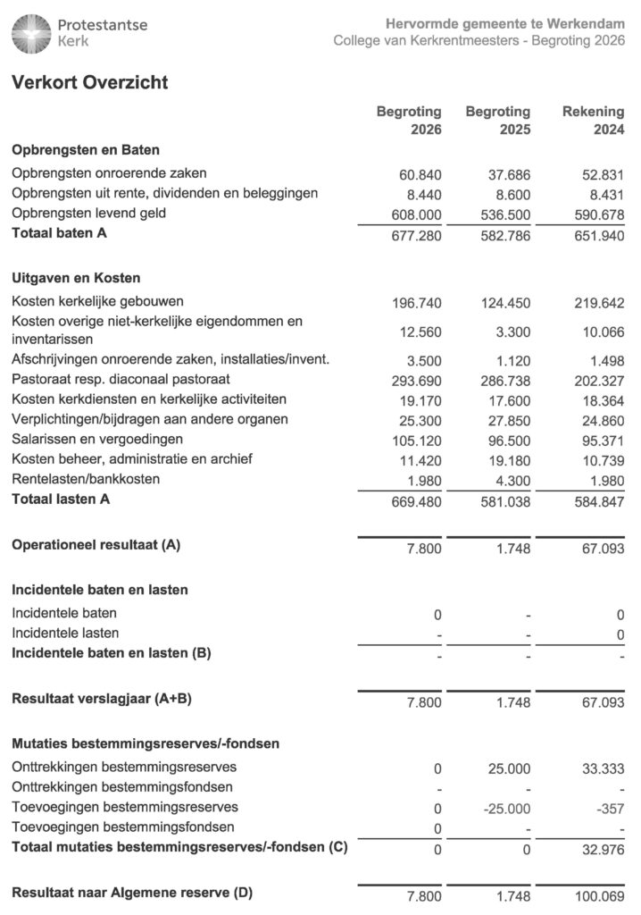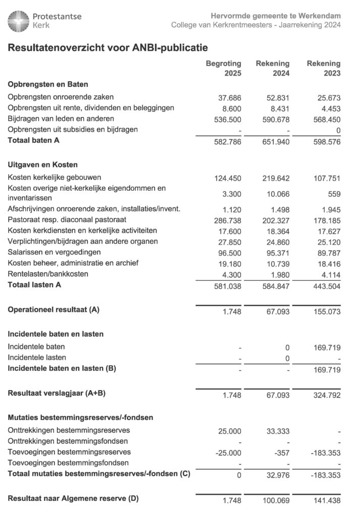 Kerkgenootschappen en hun onderdelen zorgen in Nederland zelf voor de benodigde inkomsten voor hun activiteiten. Aan de kerkleden wordt elk jaar via de Actie Kerkbalans gevraagd om hun bijdrage voor het werk van de kerkelijke gemeente waartoe zij behoren. Soms bezit de kerkelijke gemeente ook nog enig vermogen in de vorm van woningen, landerijen of geldmiddelen. Soms is dit aan de gemeente nagelaten met een specifieke bestemming. De opbrengsten van dit vermogen worden aangewend voor het werk van de gemeente. Kerken ontvangen geen overheidssubsidie in Nederland, behoudens voor de instandhouding van monumentale (kerk)gebouwen of een specifiek project. Een groot deel van de ontvangen inkomsten wordt besteed aan pastoraat, in de vorm van salarissen voor de predikant en eventuele kerkelijk werkers en aan de organisatie van kerkelijke activiteiten. Daarnaast worden de ontvangen inkomsten ook besteed aan het in stand houden van de kerkelijke bezittingen, benodigd voor het houden van de kerkdiensten (zoals onderhoud, energie, belastingen en verzekeringen) en aan de kosten van de eigen organisatie (salaris koster, eventueel overig personeel, vrijwilligers) en bijdragen voor het in stand houden van het landelijk werk. Onder lasten van beheer zijn opgenomen de kosten voor administratie en beheer van de kerkelijke bezittingen.